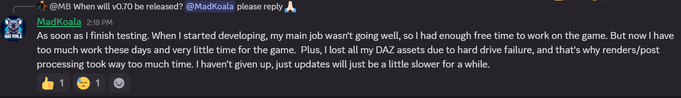 He recruited a PR man named Darkerness a while back but he really fell off the map with no info. But the dev has stuck around so far. The last 3 updates everyone gets all anxious about the game being abandoned and then boom it shows up.