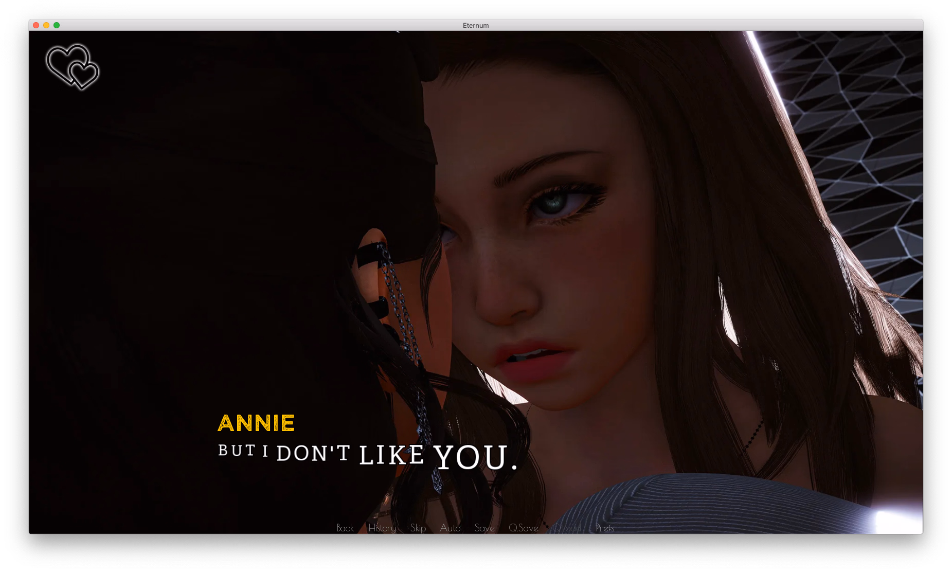 ...and it's things like that that make me think that at least some of it is "gameplay" as opposed to "you don't have to be with a LI you don't like." Some of the decisions are fairly obvious--if you don't talk with Annie after her first scene, that closes off her route. But Dalia's first off-ramp is to not peep on her in the bathroom. Peeping on her kicking her off her route I get; not peeping, not so much.