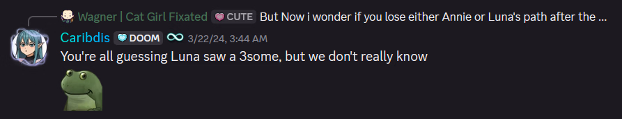 At this point i dont think thats accurate anymore. Annie seems to be aware of orion kinda dating them all (even nancy), Luna probably saw happy harem sexcapades already in the future.