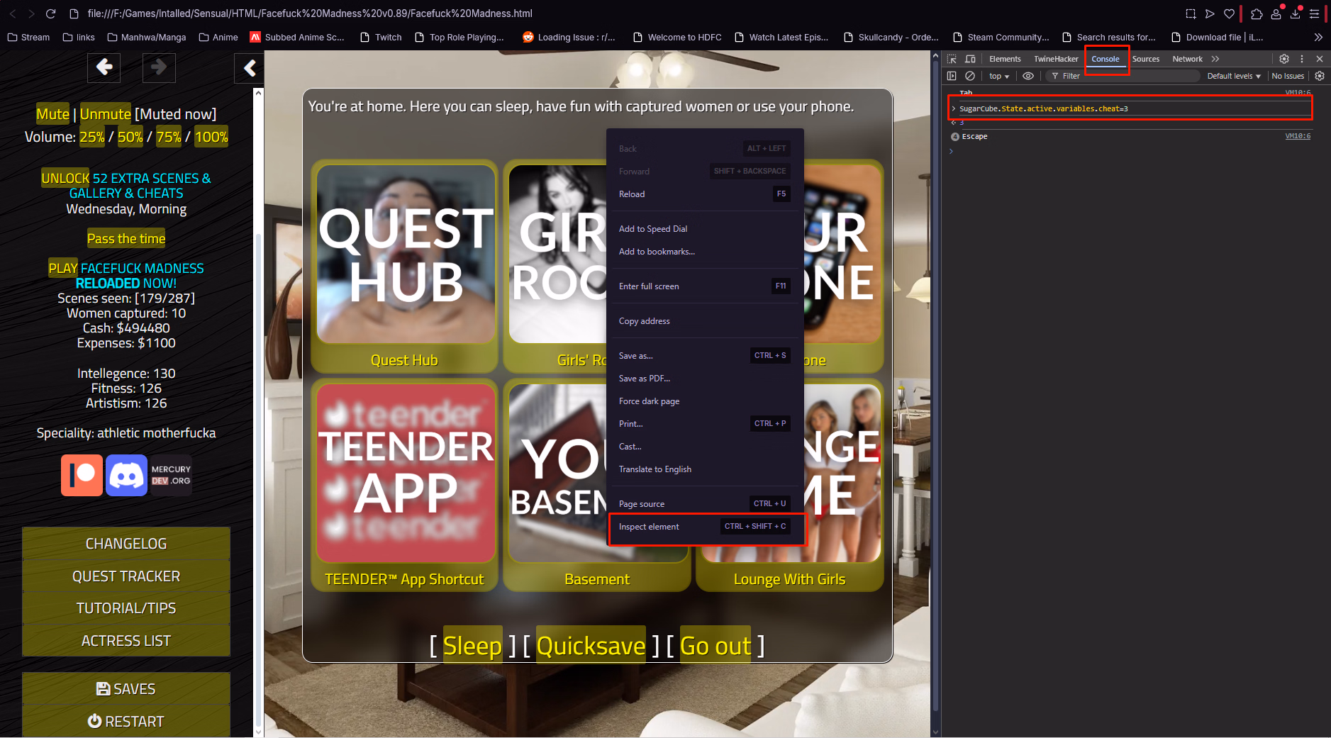 Now enter Sugarcube.State.active.variable.cheat=3 and hit Enter.