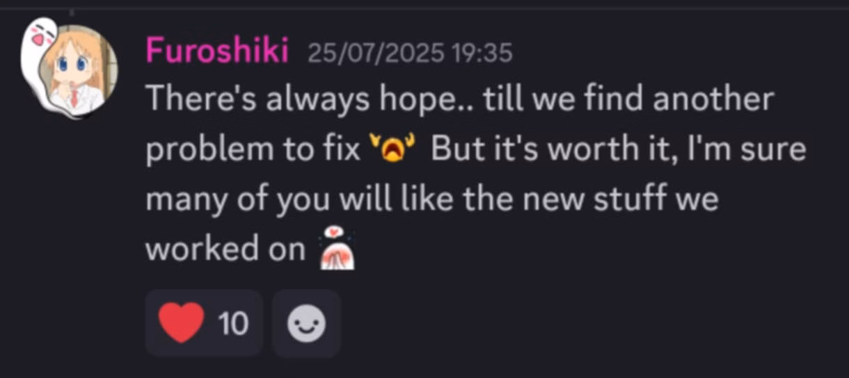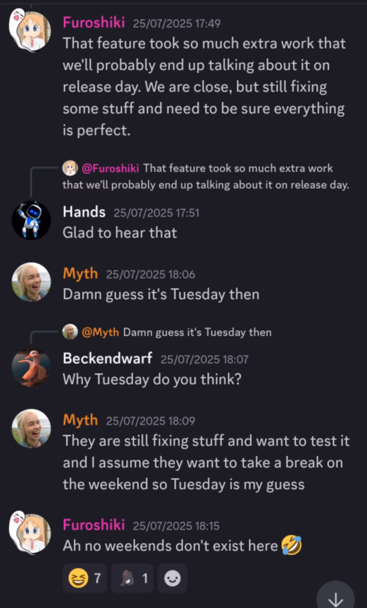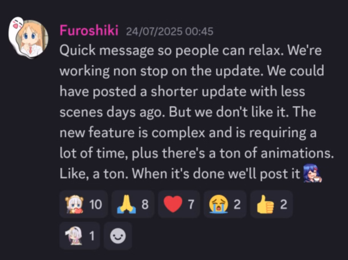 Given the quality of the animations, as well as the new features, I can understand why they're not as consistent this time around. The game seems to require more work, than previous ones.In my experience Azienda and team have only on a handful of times delayed in delivering updates every month. Once was when a team member was unwell (one week delay) and another when they were adjusting their tier levels or something (3 days). Now they are saying the delay is about some new feature they are introducing so I'm excited! I bet they will still deliver the update before month end judging from their track record.
