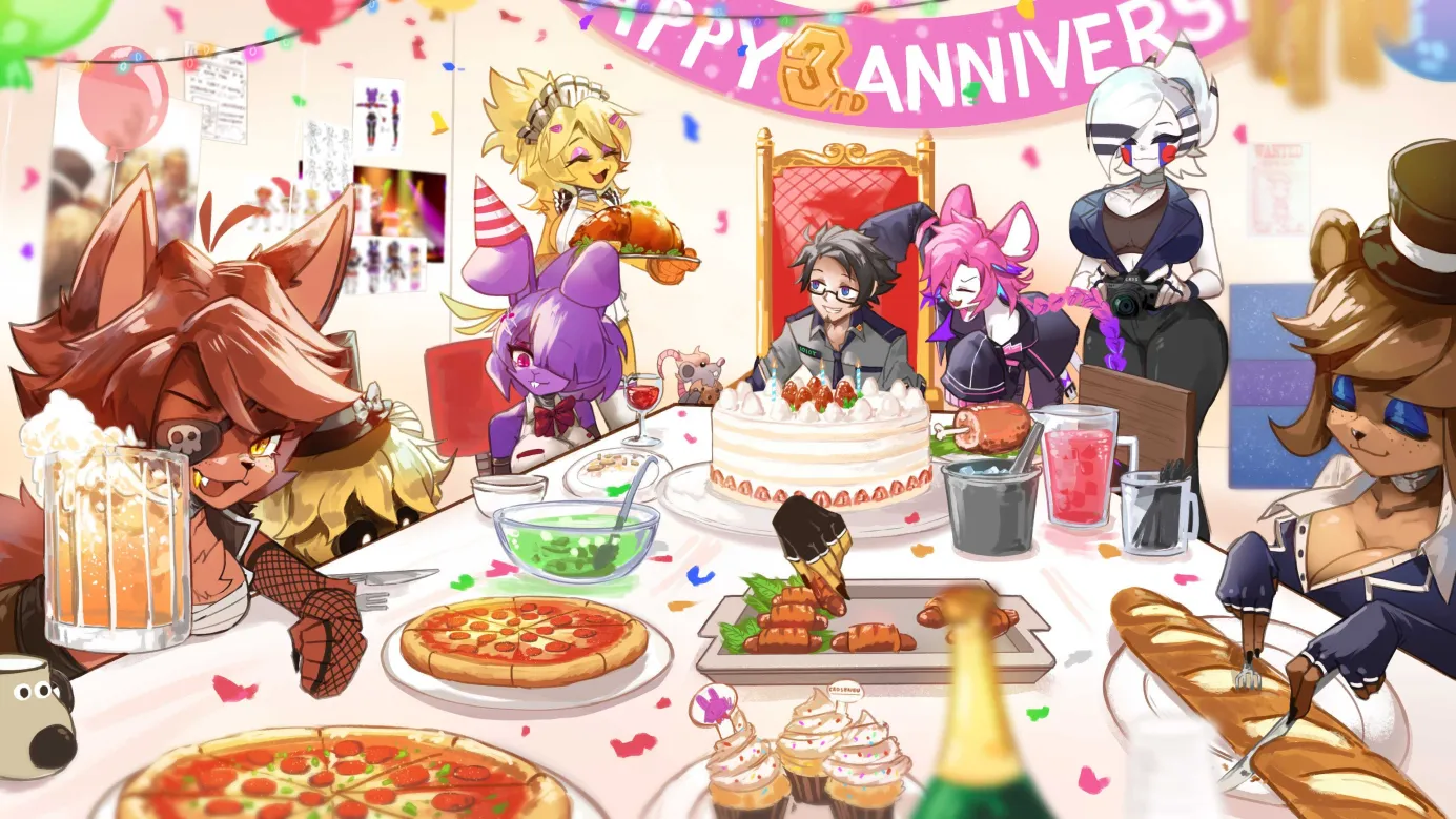 Plus really all the hall marks of ai slop arent really present, like eyes that aren't focused anywhere (bonnie's staring at the golden one, the guard is looking up at chica, fexa's staring at the viewer), the off putting shiny plastic/vaseline look, messed up tiny details and patterns eg. fexa's fishnets, pepperoni on the pizza, sprinkles on the cupcakes and brush strokes on the crust of the baguette all make perfect sense (aside from bonnie's uneven breasts and the table being skewed, but that's not something an ai would mess up, it's just basic artist mistakes (source: i am one)