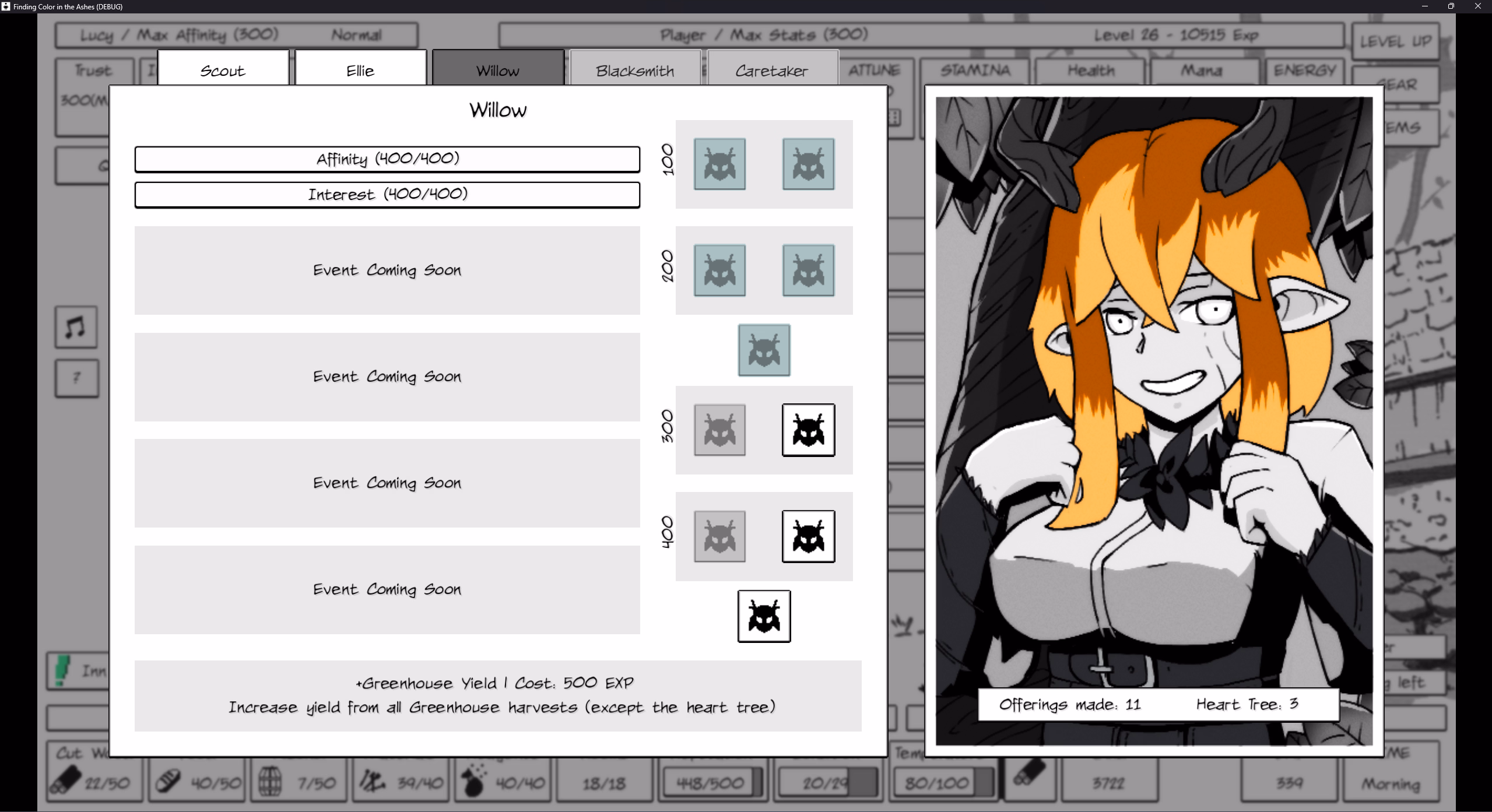 There was a nasty bug where if you used the spacebar to progress events it could break things. I fixed in in the upcoming version. There was also a sequence break where if you hired scout a little too late it could break, also fixed. The upcoming version will be out on saturday - if the issue persists then, definitely let me know!Playing on the Alpha 2.11 version and I found a freezing bug with the Scout, which is similar to what another person experienced before. Full disclosure, I do use cheat engine to freeze my stamina and max out my resources, but that's about it. When I reload and try to brute force the event/bug, I didn't use cheat engine, but the bug still kept happening