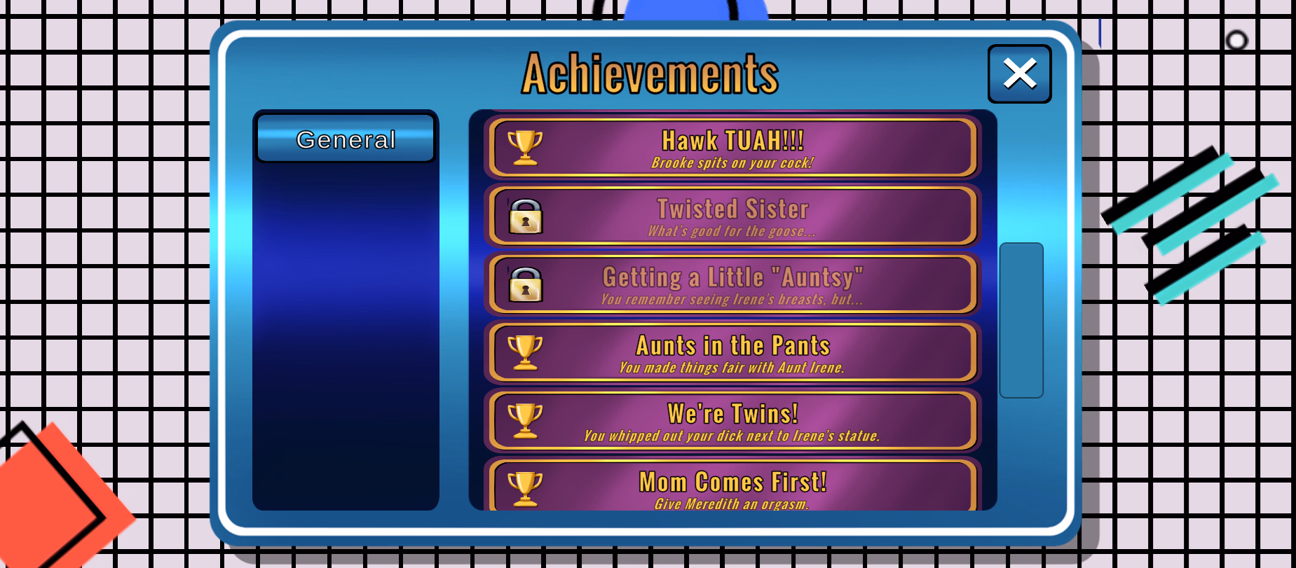 6. Too many minor improvements and bug fixes to list... (An Achievements Menu has been added to the Main Menu, Meredith Handjob scene has been improved, you can now enter Meredith's bedroom while she's using the vibrator, etc...)