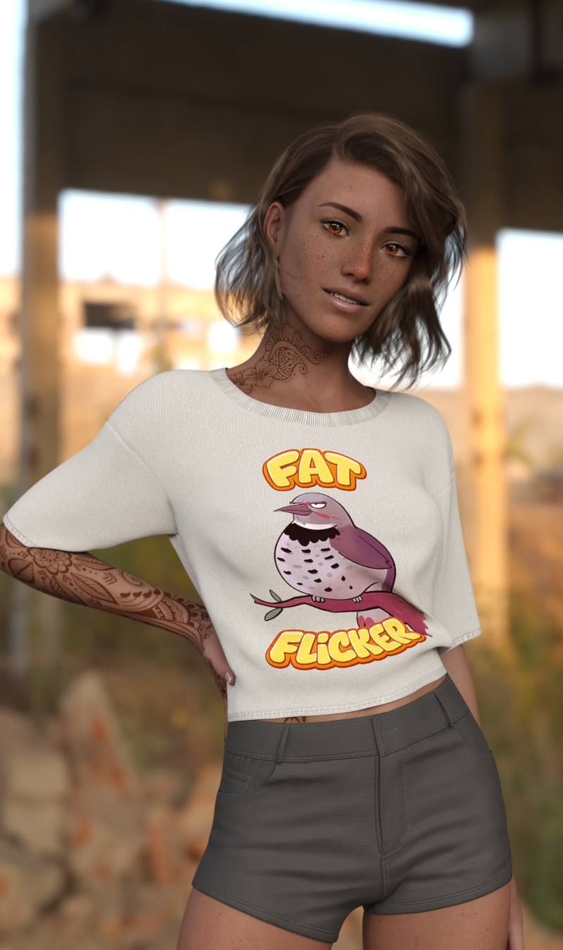 Though it's never actually mentioned in-game, Nicki hails from the state of Alabama -- whose state bird is the Northern Flicker. Since I enjoy making custom clothes for the characters, I got to thinking about what kind of goofy t-shirt I could make for her, and I landed on what you see above. For some reason I just imagine Nicki trying to explain this weird, region-specific meme to Guy, about a fat bird whose name looks rather dirty if it's written in all-caps with the letters mashed together.
