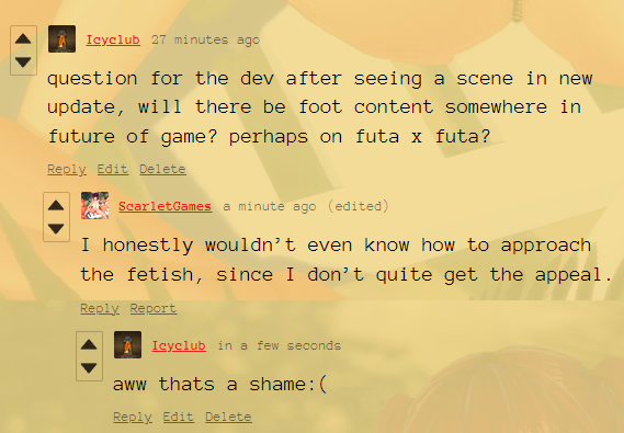 Brother, I don't mean to be rude, but where is all this "constructive" criticism you keep referencing? The grand majority of the negative feedback is not constructive by any metric, it's just people whining that there's no sex in this update and/or dooming about the f/f path supposedly being the priority now. Vapid shit, mostly. Now, could Scarlet do something productive with this type of feedback? Possibly. That doesn't make it helpful or valuable on its own, however.