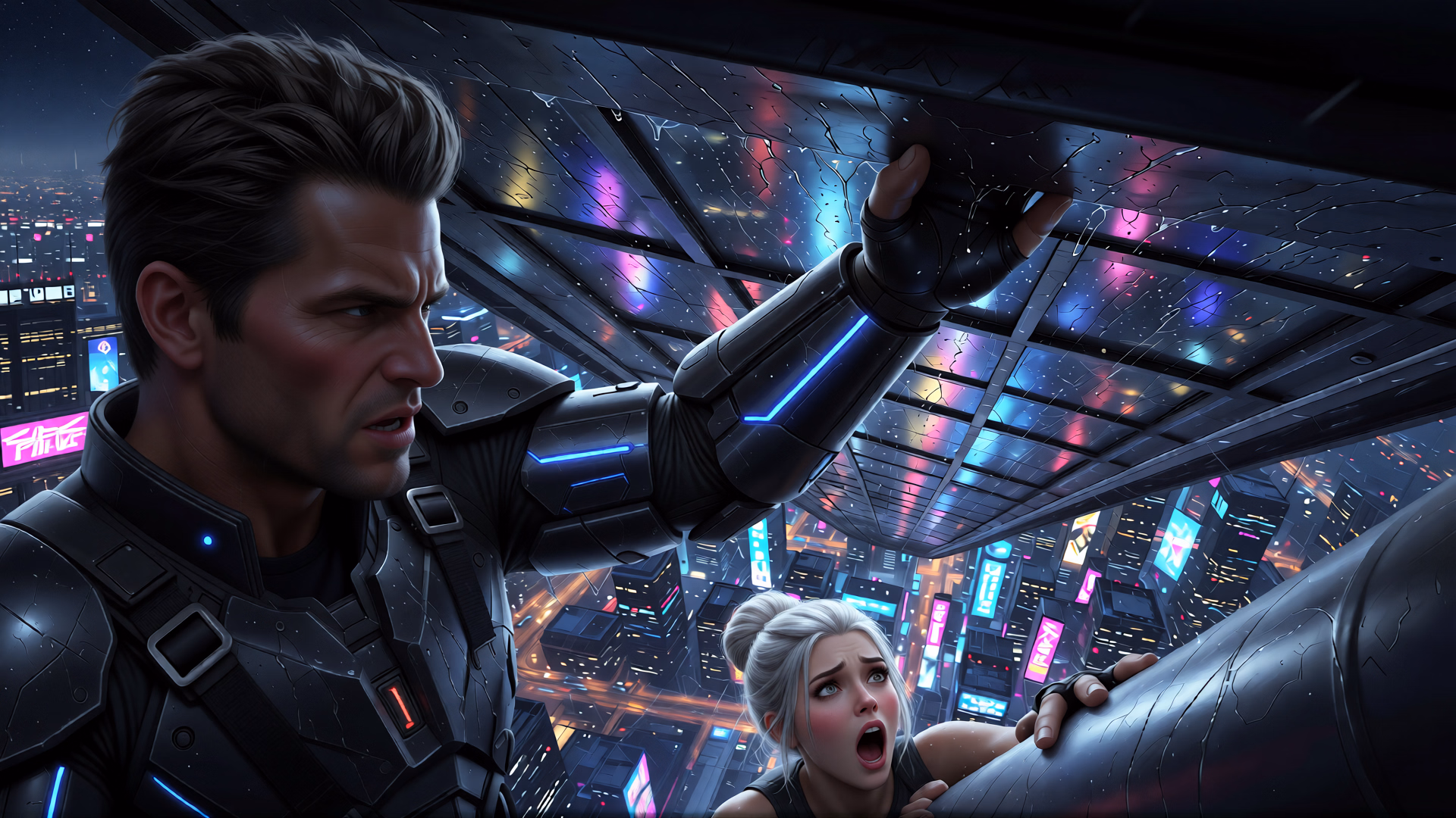 - Part 1: Infiltration & Escape (Current Focus) – Covers the mission failure, the desperate skyscraper climb, and the frantic drone chase to the lower city. The script and core visual direction are complete.