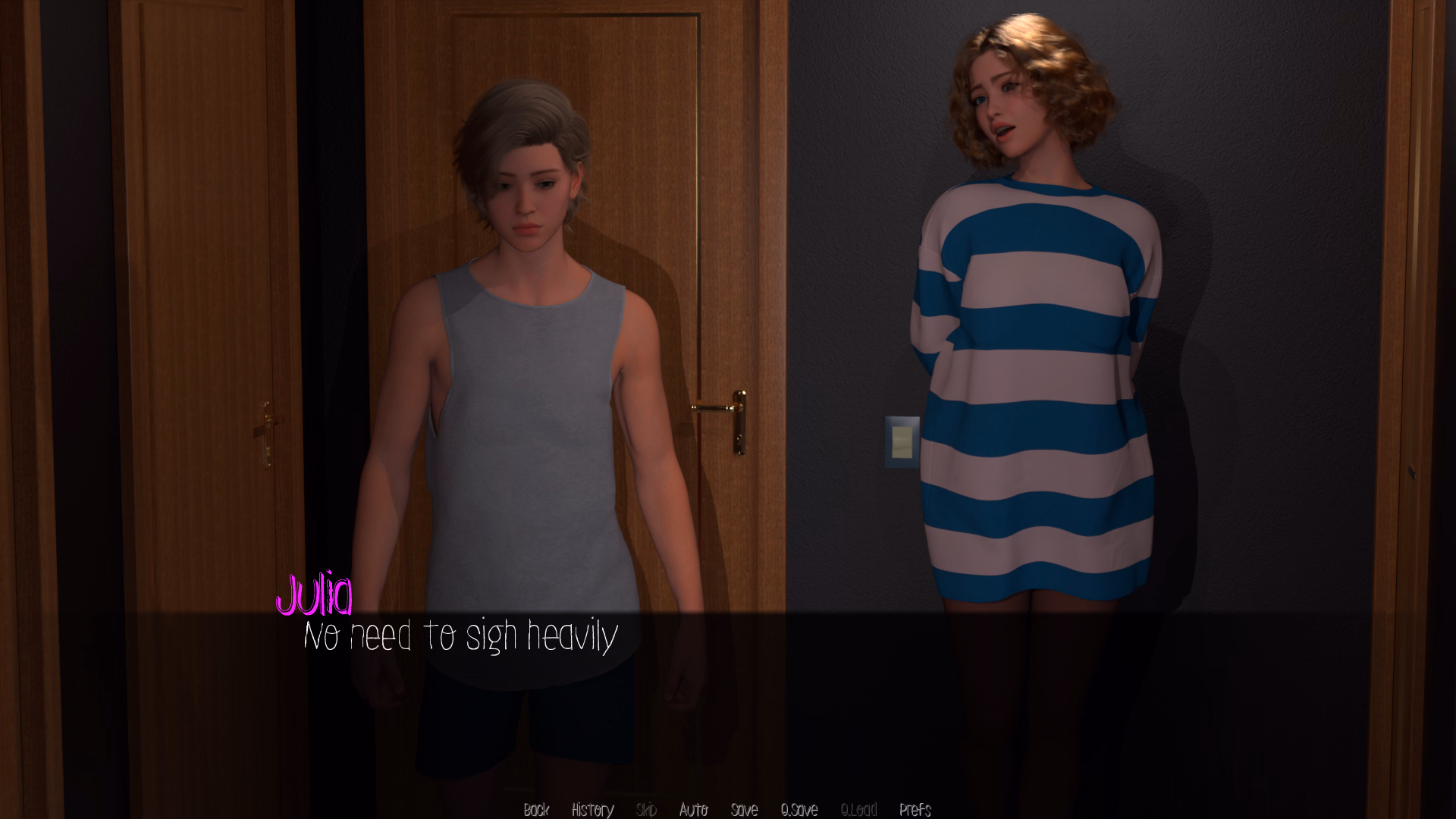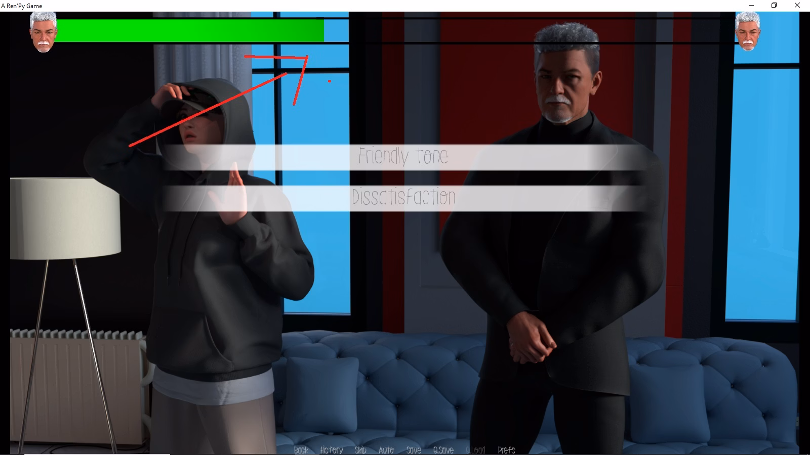 It's simpler than that. The goal is to convince the dad that MC is actually his sister. You have to make choices the way his sister would, to avoid suspicion from their dad. Julia is a bit of a cocky bitch who isn't afraid to give their dad a piece of her mind, and she loves clothes/shoes, so MC has to act interested in his gift.Nope, there is some sort of game over there, a time-looping, you can't let the bar reach the dad... I didn't get it, but I passed that stage by not being submissive all the time. It seems the first stage of sissification, where he gives the MC a woman's boot. After this "battle", the AVN keeps going. Weird...