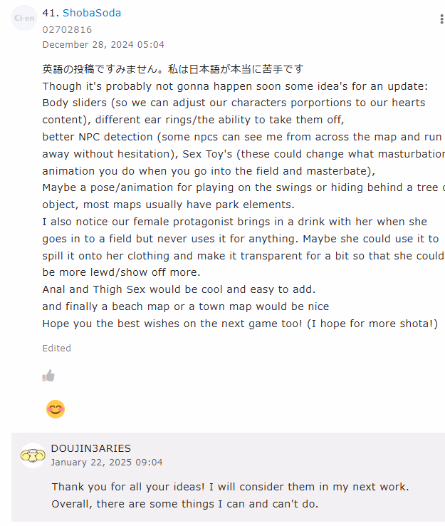 I love this game, it has my favorite tags (sh0ta, exhibitionism and cuckold) all in one game , and I agree that it needs more stuff, outfits, locations (I'd like a mall and the outskirts of a school) and of course more sexual stuff (gangbang, anal, dp, etc). Unfortunately, people have said that the developer will no longer work on it, but from what I've read in the other comments, the only option left is to ask the developer to add the option to support mods. So I propose that we agree to do it, maybe if enough people do it the developer will listen to our pleas. Does anyone know how to contact him? Leave his (or her) email and whoever wants to ask him for the mods option can do so. What do you say?