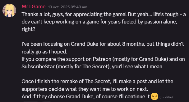 - the update interval for this VN was 1 month according to my notes, and there is no lasting annoucement of a change in developement rythme/plan (patreon, blog/f95zone, etc.) which is always bad news;