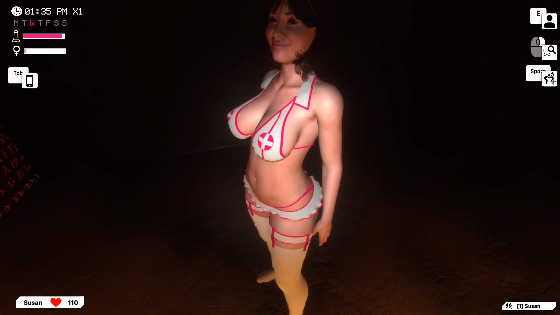 I'm generally loving the set-up, but the controls for sex scenes felt weirdly cumbersome. I don't know if that was because I'm not playing in VR, something to do with phallus size or just.. the sheer NUANCE of the sex sim. I can't help but wonder if there's a more intuitive way to line up the dong with what you wanna thrust into.