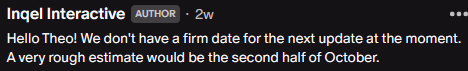 Nothing publicly posted since Sept 5th. Perhaps a Patreon supporter knows more...Any news guys ?