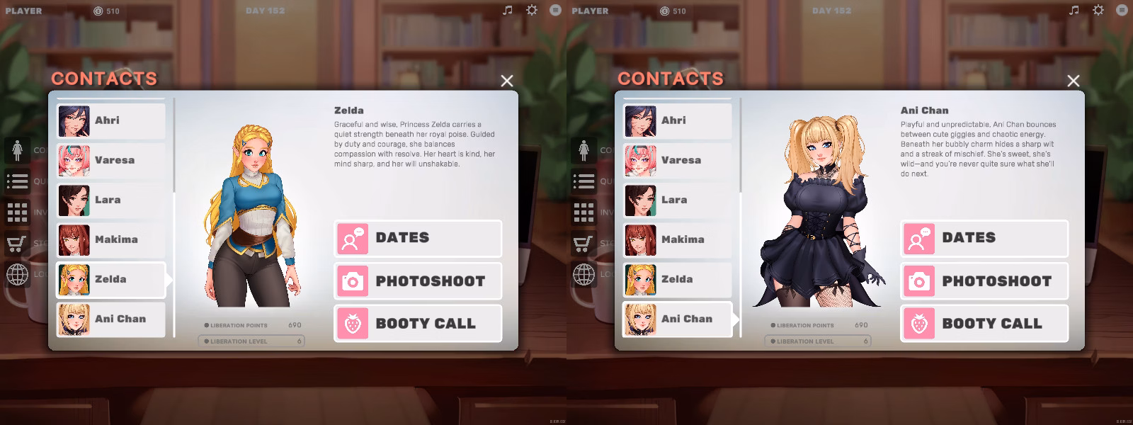 I would like to see more customization for each girl in general, like being able to change eye color, hair color, etc as well as the ability to remove the long talon colored nails every girl for some unnecessary reason seems to have to just normal non-colored nails. Also would be nice to see more clothing options, and the ability to select each individual piece of clothing on each body part instead of being locked into selecting one clothing set only. It would be nice to mix and match different clothing pieces.