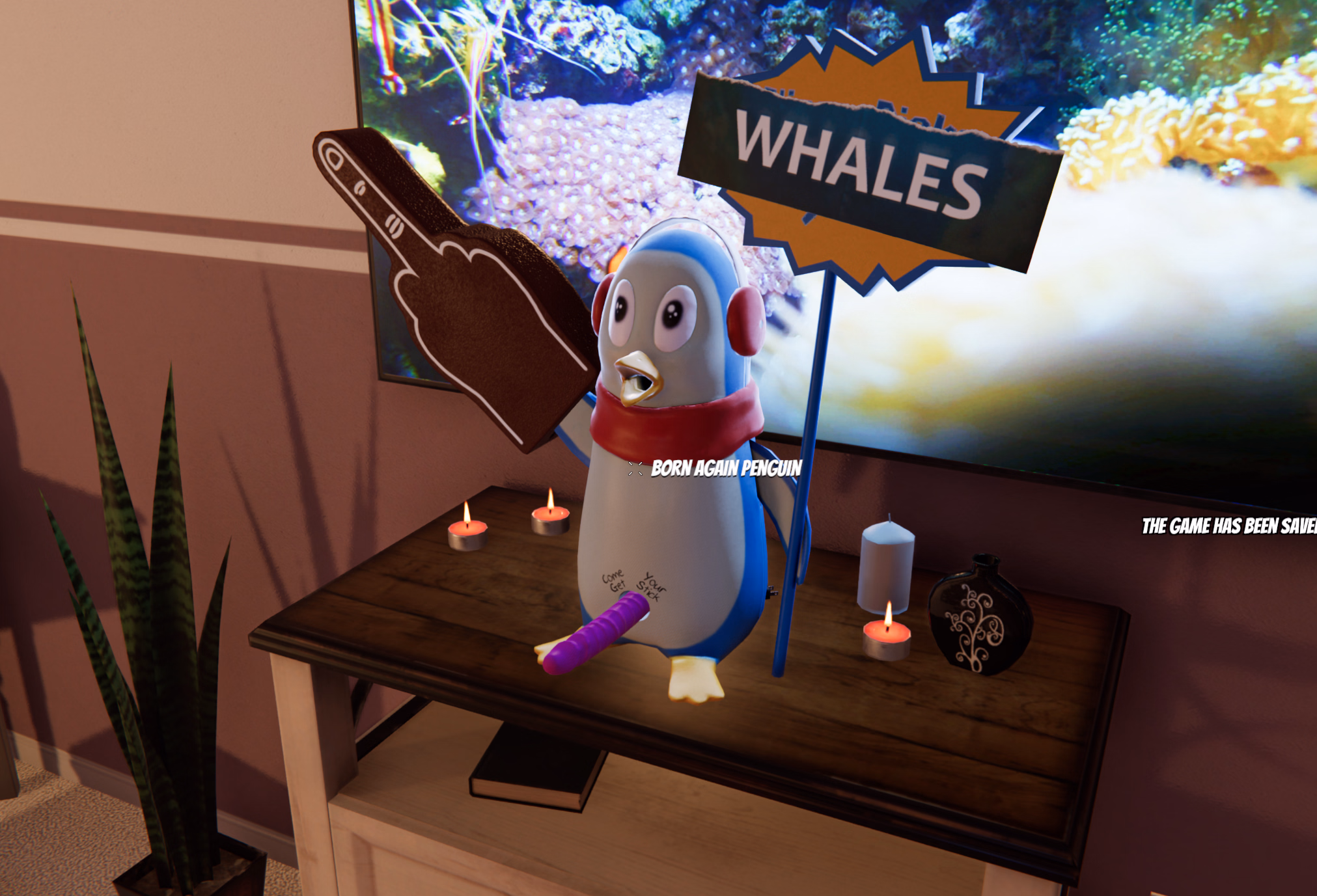 For the penguin itself, all you need to beat Derek is the Whale sign, the foam finger, and Ashley’s dildo from her room. You only need to use the wrong items if you’re trying to get the female player exclusive Host Hijinks opportunity.