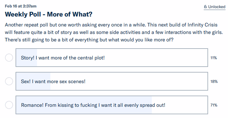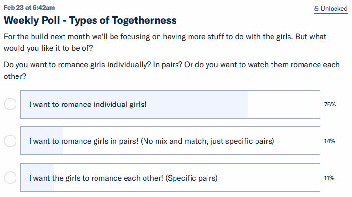 6. We do new builds every month for $10 patrons and the next build will be focusing on furthering relationships and polls have been done the past few weeks to figure out what to focus on for this update and next update. There's a lot of writing and art that will be going into this update as we halt story progress for a bit. There's a lot of characters and interactions that need to be done and expanded upon.