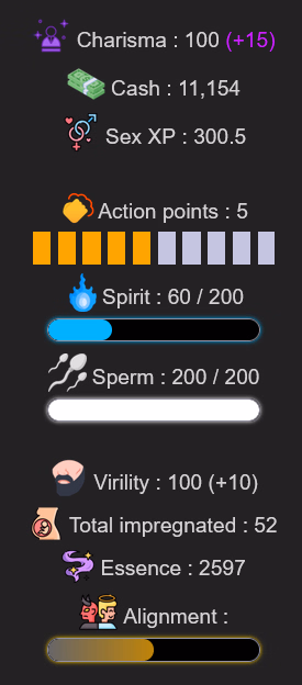 + Added an alignment stat, influenced by various existing actions, with effects on affinity and submissiveness of the girls you meet