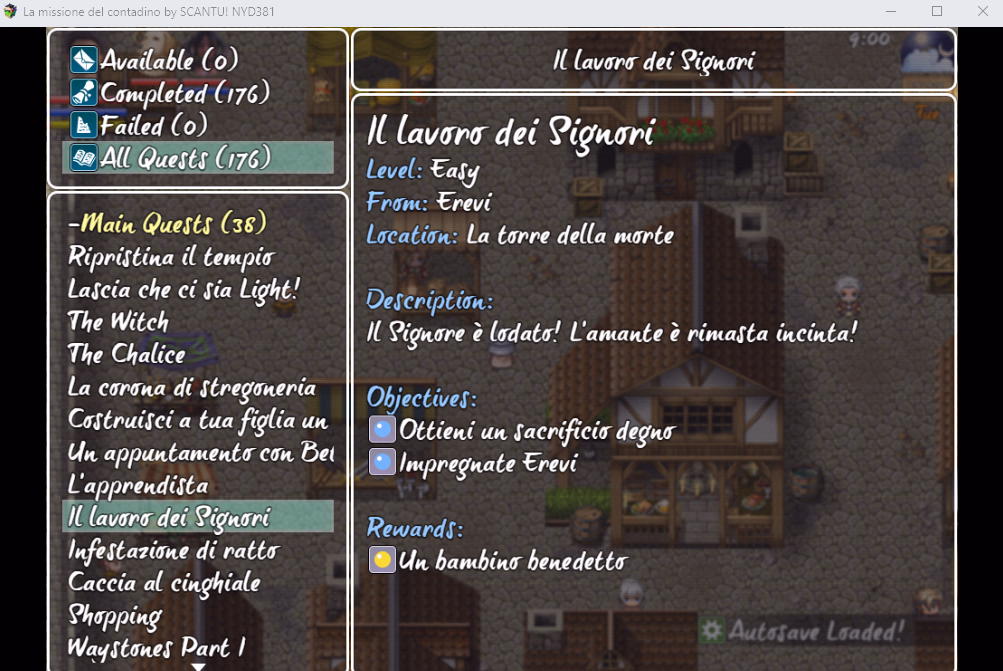 Ciao ti invio in allegato file compresso con allegati l'ultima schermata col blocco del gioco che si verifica quando cerco di salvare e l'ultimo save fatto prima che si verifica quello,cioè a inizio della scena dove lei vuole entrare in paese.allega il save fatto un click prima del blocco