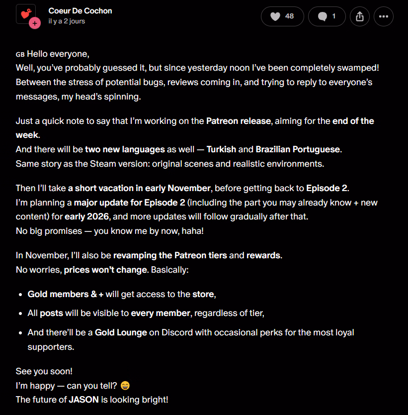 Guys there is literally a free post from his patreon on this forum just a couple pages back saying how he is working on episode 2 and expects it out by early 2026.