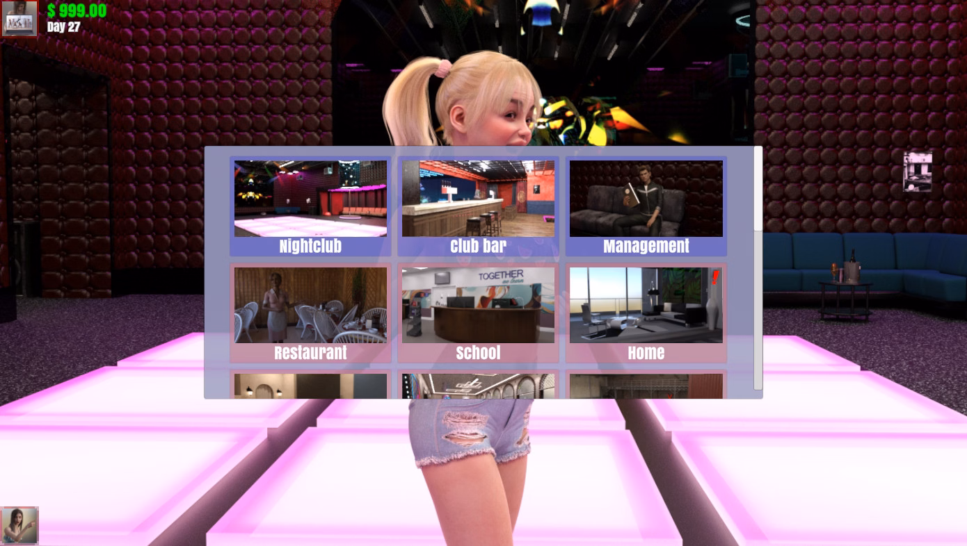 This is the default chat dialog. It has a profile picture and usually the name of the person within the header with the text in the field next to it. The "eye" icon in the top right will hide the dialog so you can see the entire image. In the top-left is the icon to return the the menu. Next to that is your current amount of cash and the day of the month indicator. Bottom right is the button to proceed, but you can also click anywhere at the screen to do just that.