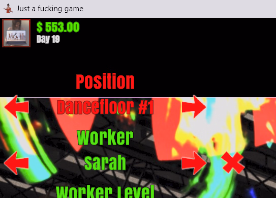 The following interface is for the club's management. There are several positions there to pick (bar duty, dancefloor, pleasure rooms, web cam room, secret room) and each of those positions could have a worker assigned. You can scroll through them using the arrows and de-assign a worker with the cross. Select tasks the worker should perform using the checkboxes and view the worker in action using the "Visit as a client" button. The clubs financial status can be checked with the Financial button: