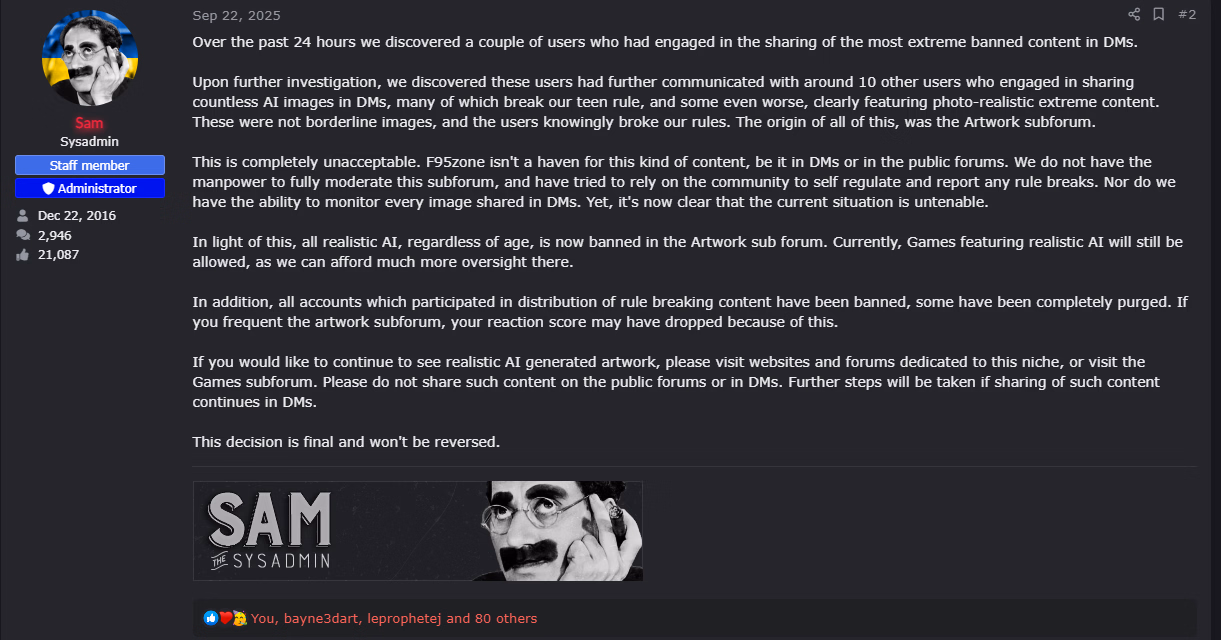 This could be worded better but the way I read it is as long as the AI content is within the scope of that specific game (and obviously not teen content) and not random artwork it's fine, no? Seems to be in line with what Sam is saying above too: "banned in the Artwork sub forum...if you would like to continue to see realistic AI...visit the Games subforum". That message reads like it's targeted specifically at the artwork subforum. But I could be misinterpreting it.