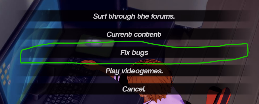 Hi, a few days ago I learned how to fix these old save issues just by loading the game. But before that, I added this option on the computer to help fix these kinds of problems. When you click on “fix a bug,” it’ll probably still appear in the menu — that’s just because I didn’t properly code it to disappear after being fixed. I tested it briefly with a friend and it seemed to work, so it’ll probably work for you too.Okay, every single time I finish and event, this happens: View attachment 5350229