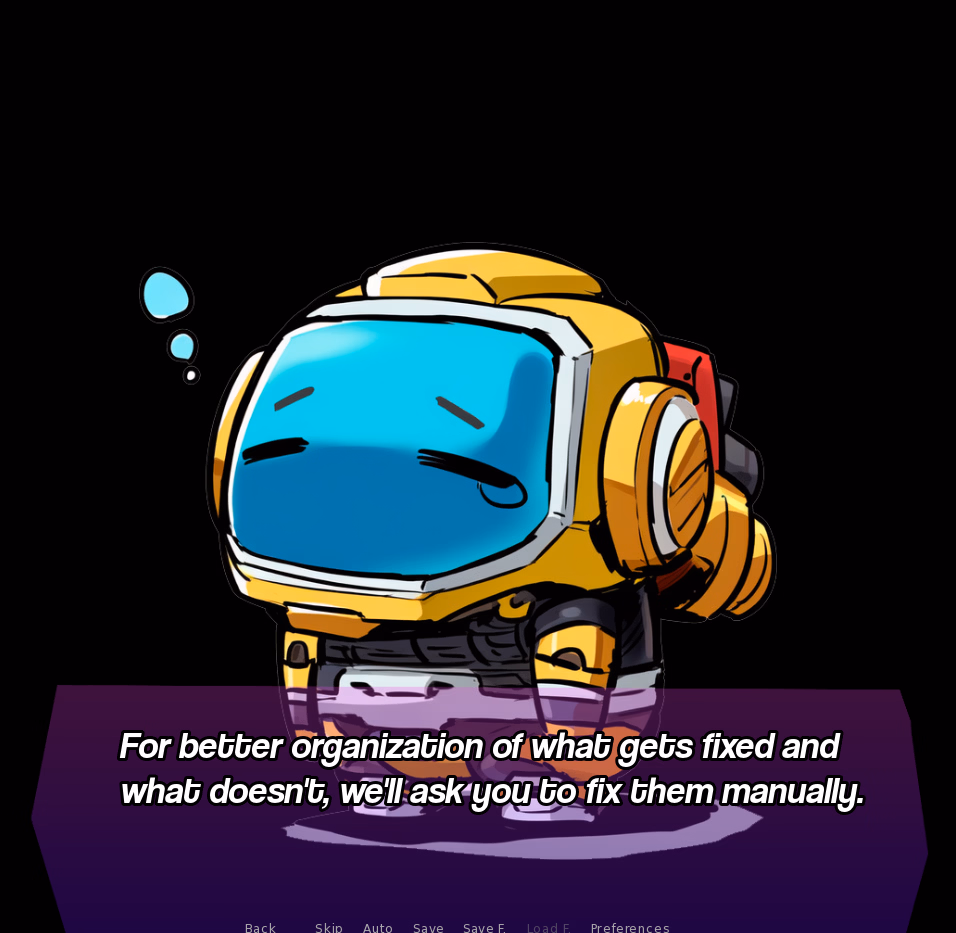 Yeah the thing, I did notice that button. However, when I clicked, this happens:Hi, a few days ago I learned how to fix these old save issues just by loading the game. But before that, I added this option on the computer to help fix these kinds of problems. When you click on “fix a bug,” it’ll probably still appear in the menu — that’s just because I didn’t properly code it to disappear after being fixed. I tested it briefly with a friend and it seemed to work, so it’ll probably work for you too.