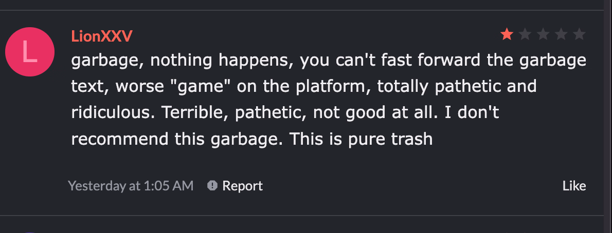 And I ain't saying what you should or shouldn't do! I'm just trying to make the game more readable for you guys, that are more vocal about leaving bad reviews/comments. I understand that you want to keep playing the game, the NTS path was already a response to your feedback (and for any one else that likes NTS too, of course).