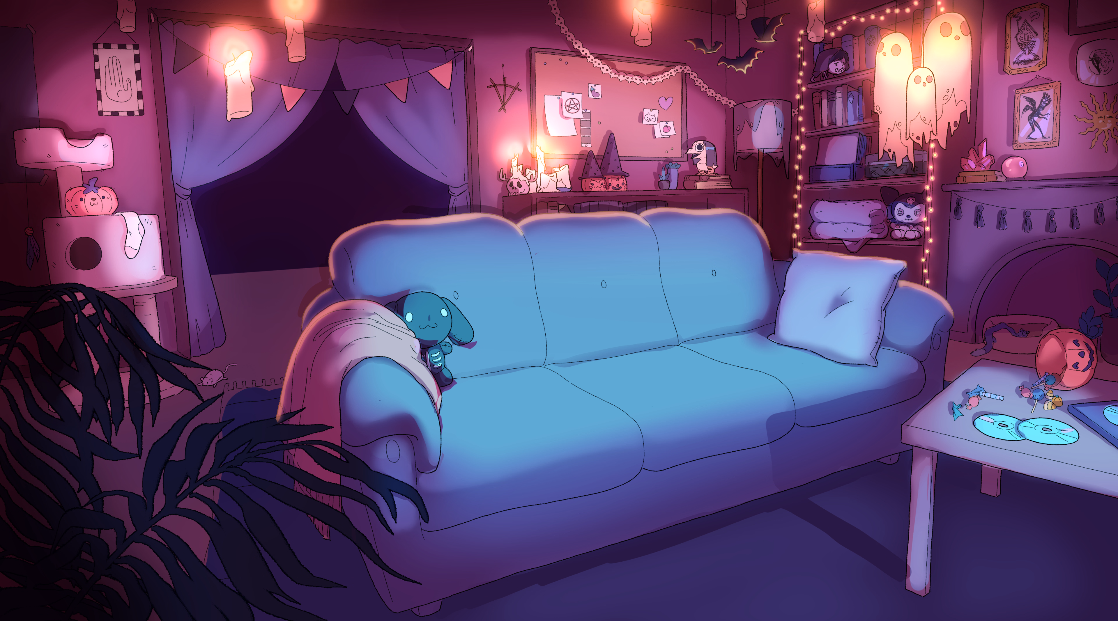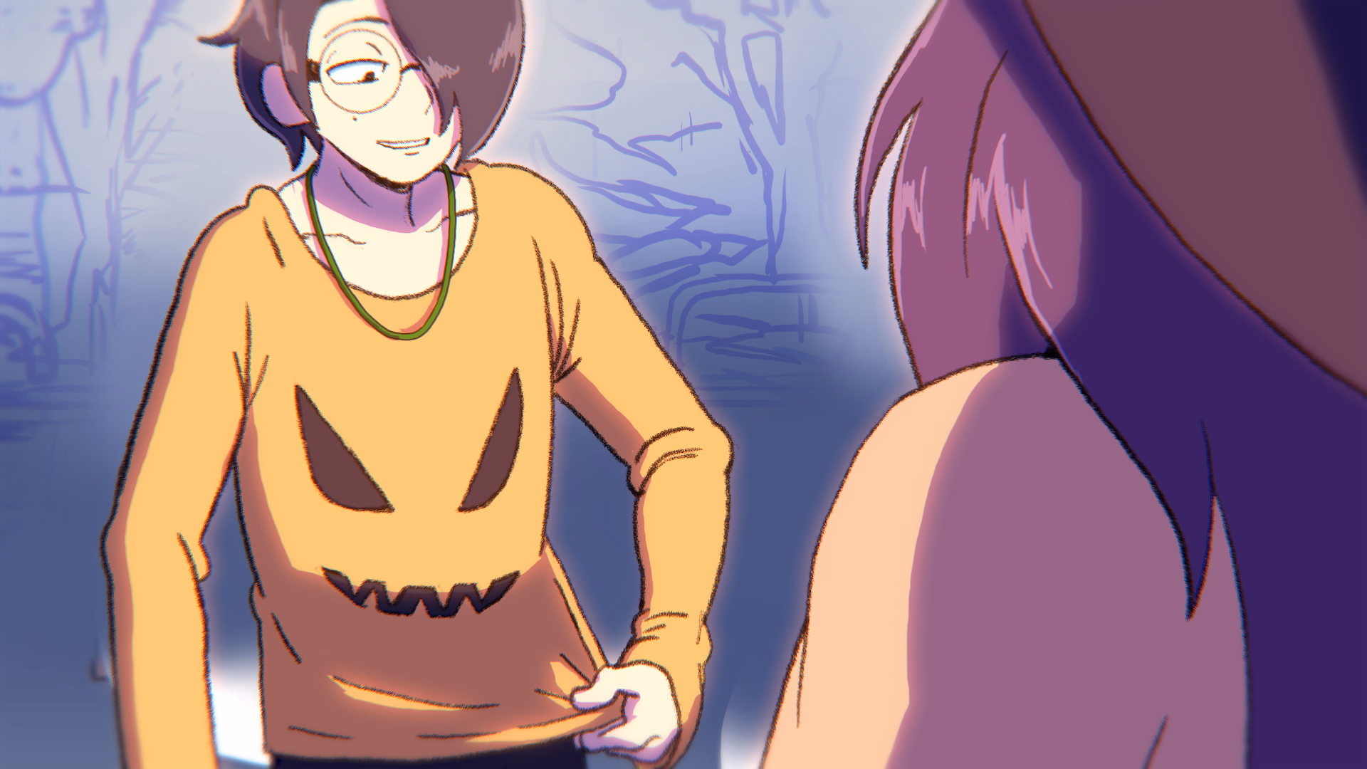The "why would we need a tv" shot you saw last time, along with the sloppy make-out scene ( which ended up requiring more work than I anticipated ), and a new, simple scene of the characters walking past the tarot-card shrine.
