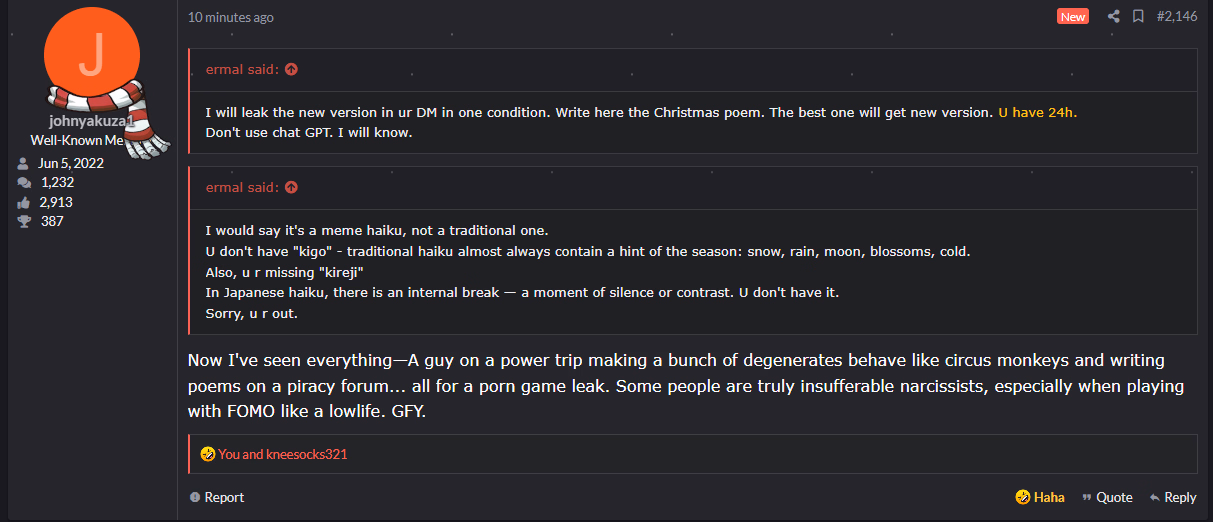 Take notes, people—That's a real hero, right here... not like the bitchass guy that was making people write haikus in exchange for the game. It's a good thing that the moderators stepped in quickly. :Kappa: