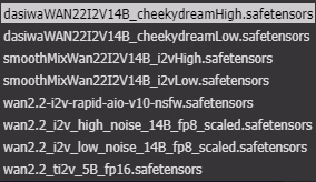 Primarily dasiwa, smoothmix and the OG wan2.2 i2v models. dasiwa and smoothmix are merged with lightning LoRAs already so don't stack another lightning LoRA with those two. The 5b model I was just using to test some stuff, I'll probably delete it but the rest are useful ^_^