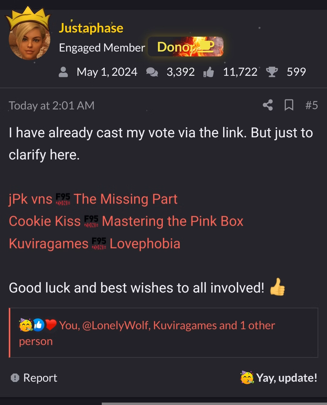 Lovephobia has one of my votes too.Congratulations Kuviragames on having votes in the Christmas Contest thread!!