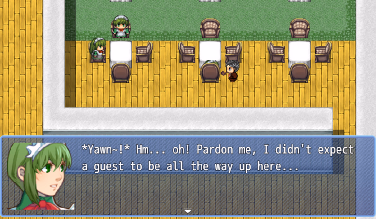 She's hard to see and easy to miss with the back of the chair covering all but the top of her head, but she's there. The context she gives for the other Maid should come before you talk to the other one, though, so I moved her (and on a separate note, there's another Maid in the southern chair at the table next to them).