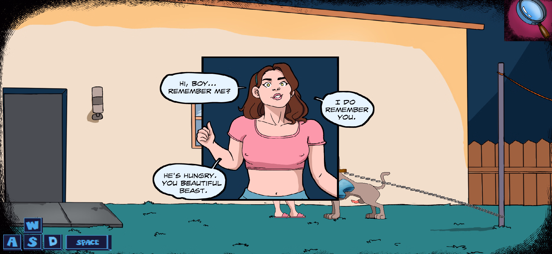 Where is it? Because the pet food isn't showing up for me, and I don't know where to find it.When you start out, you have to talk to the dog first, go back inside, get food from counter/cupboard, give him the food, go to the rightmost room, grab a key, release the dog, take it back inside, then fuck him. It's an incredibly lazy and pointless back and forth. The actions that have a heart are buggy and can simply refuse to trigger/work when you press Space or W+Space