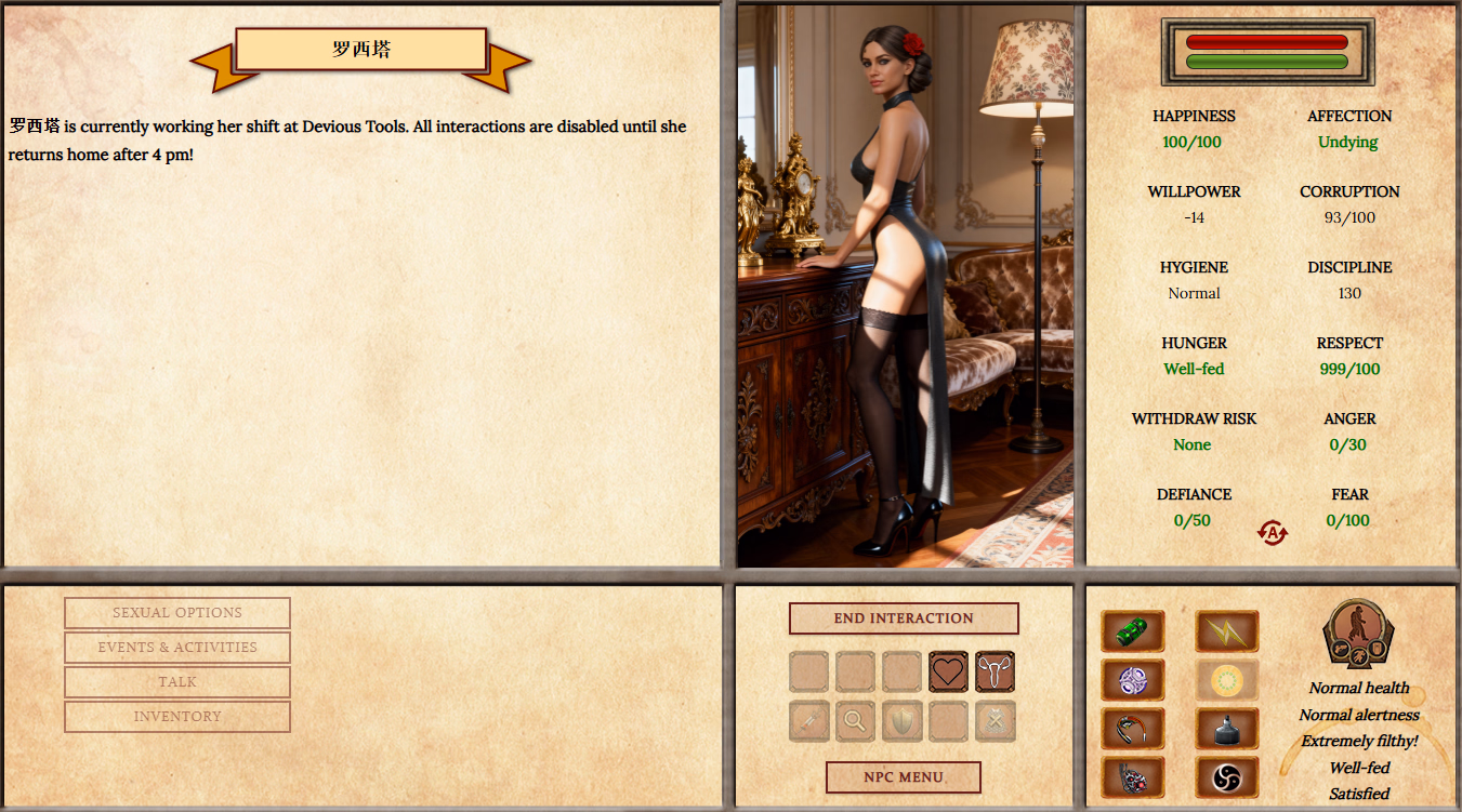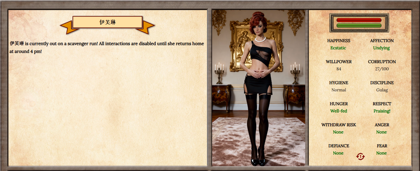 I definitely can see the argument for Corruption being overhauled. I think as is, it's too broad and basically amounts to "Not vanilla." I think dividing it into various categories, such as bondage, exhibitionism/humiliation, sadism, masochism, dominance, and submission would be a good start. Let you have girls that are subservient, but don't necessarily like being punished, or girls who like pain and like to be brats and not do what they're told until they're made to. Girls who like to be bound and left as a pretty ornament or decoration, and ones who get antsy if they can't prove they're useful with a task. And to have essentially middle managers for you. Girls who are submissive towards you, but still delight in asserting power over others lower in the pecking order.