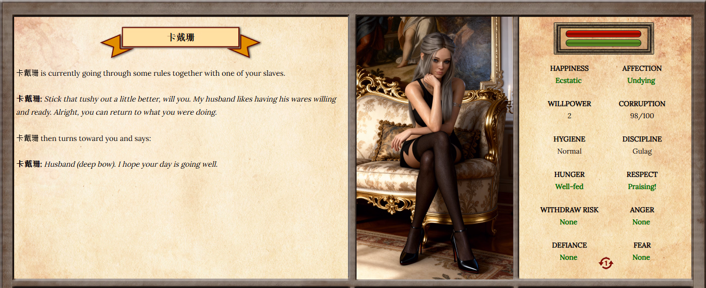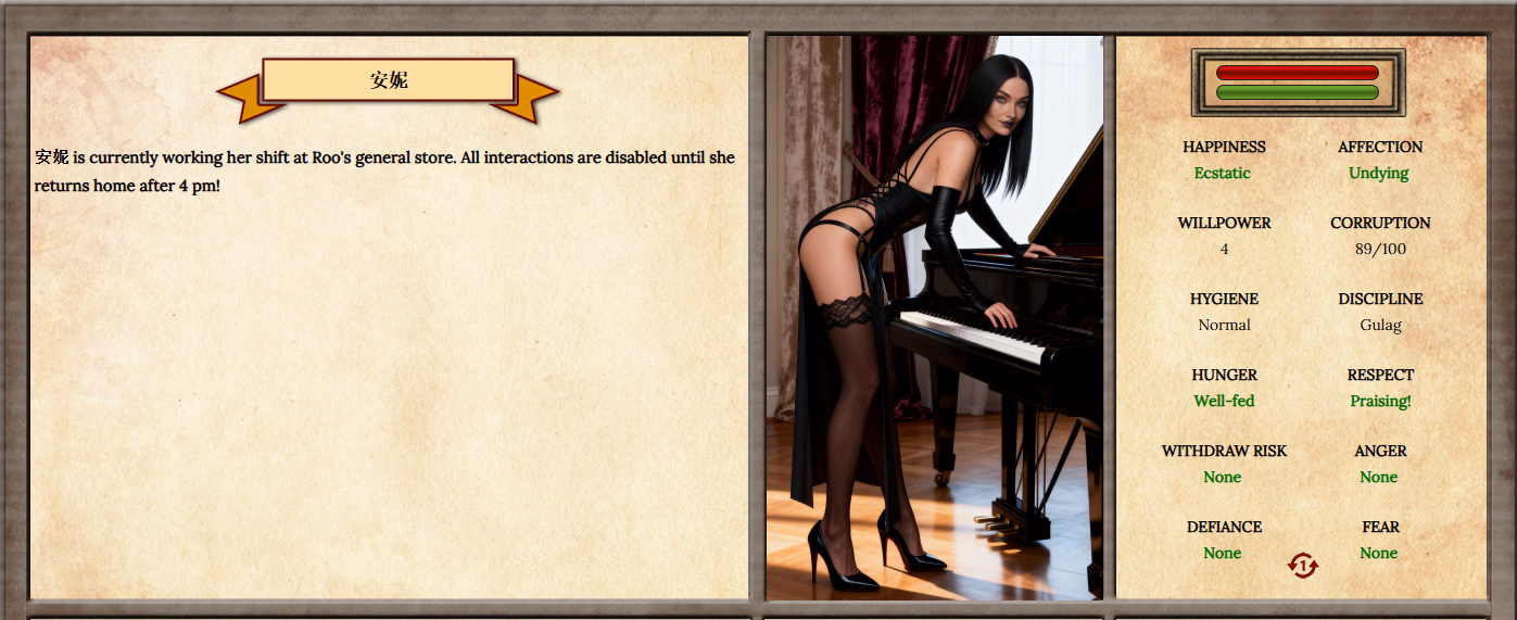 What i would suggest is a corruption system, which works the opposite. Easy to get a little corruption, but near impossible to max out. With jobs limited by corruption, branching up. So you can not train a milk cow, they way you would train a whore, a cock sucker, anal slut or furniture. So Slaves would have built character. Rather than every girl is an incel Girlfriend-dream...