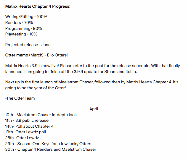 Now... where does that leave us with development! Well, Maelstrom Chapter 1 is ready to go once the animations are finished. I'm having someone do them so I can concentrate on finishing Chapter 4 of Matrix Hearts.
