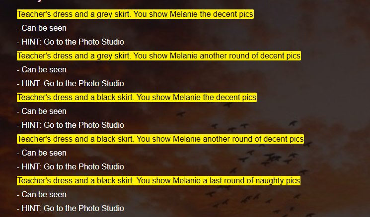 The focus of the version is Melanie in the photo studio. There are four new scenes, where she tries on different garments. You need to reach the later stages of the game (at least lust: 7 and affection: 6) before the scenes are available.