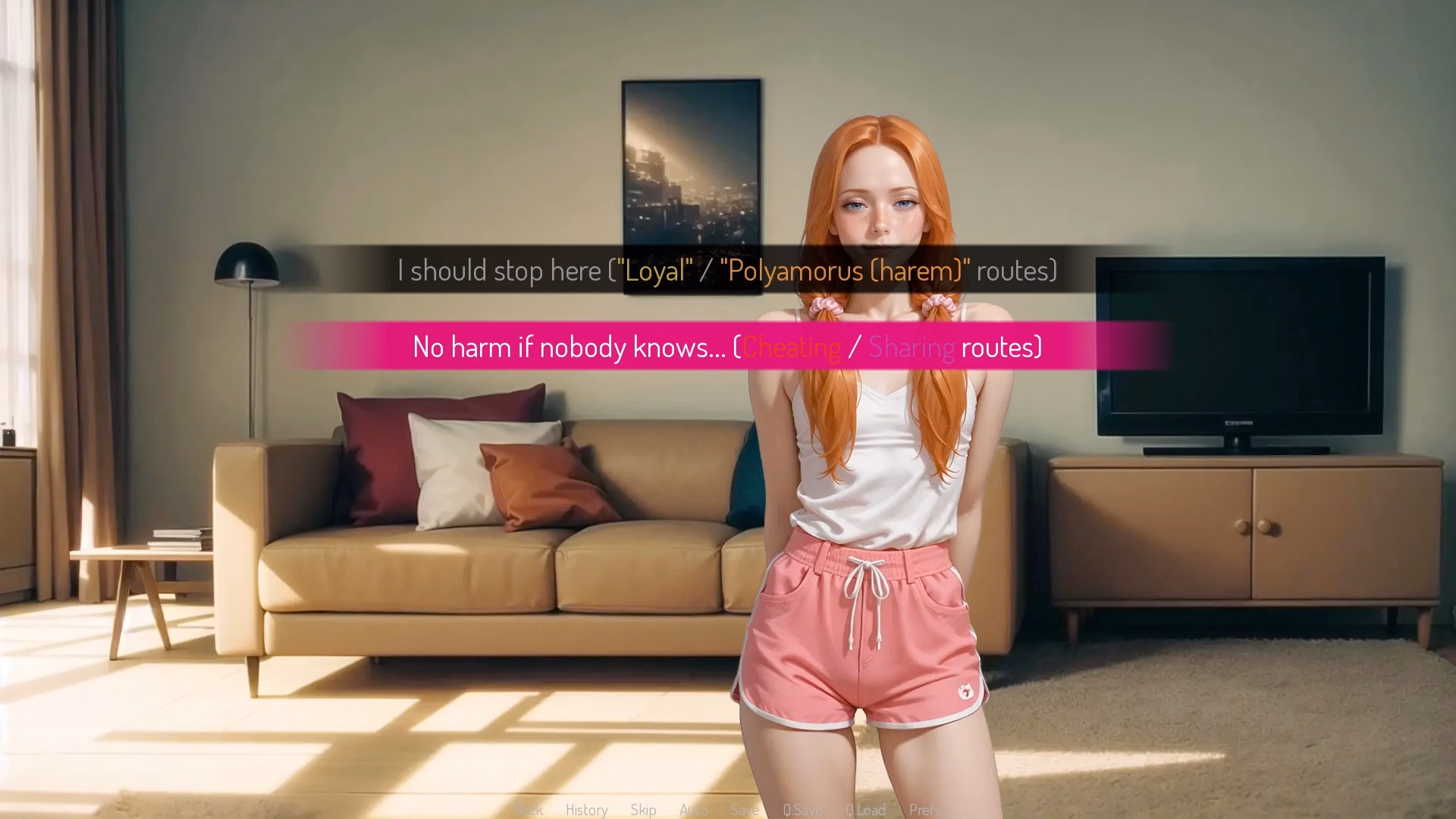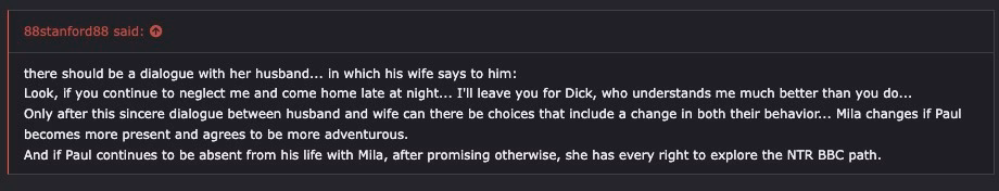 Something doesn't add up in what you write because Mila's real thoughts are that she chose NTR because her marriage had become boring and she was tired of having vanilla sex with her husband, and all this happens at the beginning of the story, is she deliberately signed up to a forum where she was strongly attracted to a page that talks about women's desire to have sex with black men... She even chatted on the phone with the page administrator, whose name is Dick...I think something this game does really well is diving into Mila's internal thoughts and emotional reactions to things in a way that I've not seen many other similar style games do.