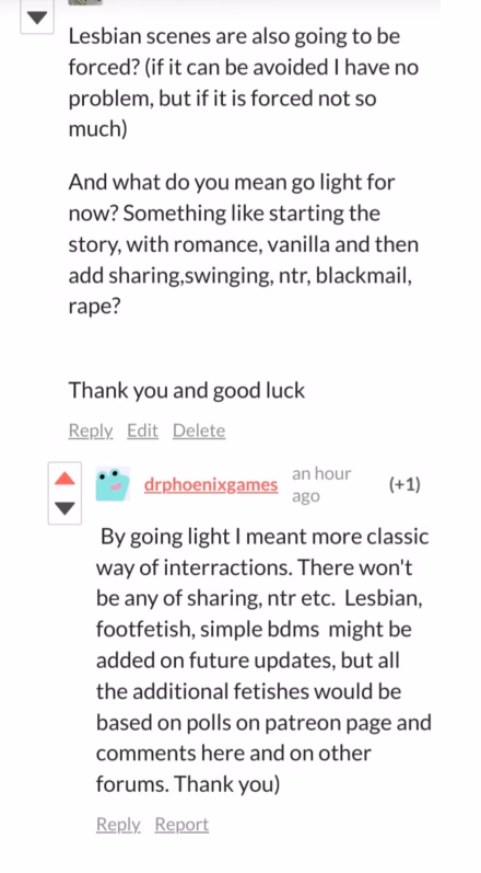 DEV:By going light I meant more classic way of interractions. There won'tbe any of sharing, ntr etc. Lesbian,footfetish, simple bdms might be added onfutureupdates,butallthe additional fetishes would be based on polls on patreon page and comments here and on otherforums. Thank you)
