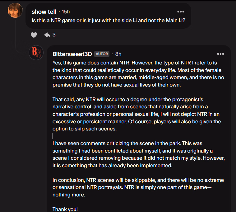 I don't know if this has already been posted (sorry, I'm too lazy to look at all the pages), but here's the developer's response. I'm happy, I'll be watching my hot MILFs in NTR scenes.