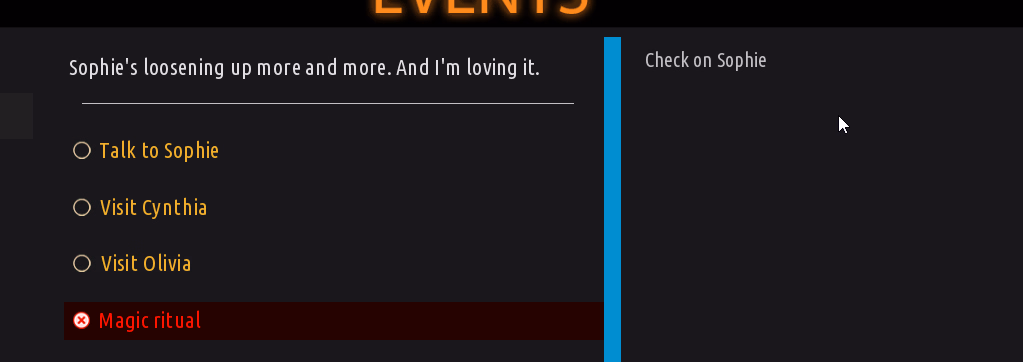 There's been no break from things since the sex scene with Olivia in the living room, as soon as that's done you get a message from Ruth and after that the 'x' is already there. I even tried going back and telling Ruth I wasn't coming but that didn't help. Have no idea how far back I'd need to go.....extremely frustrating as the options to actually check Events are slim at this point