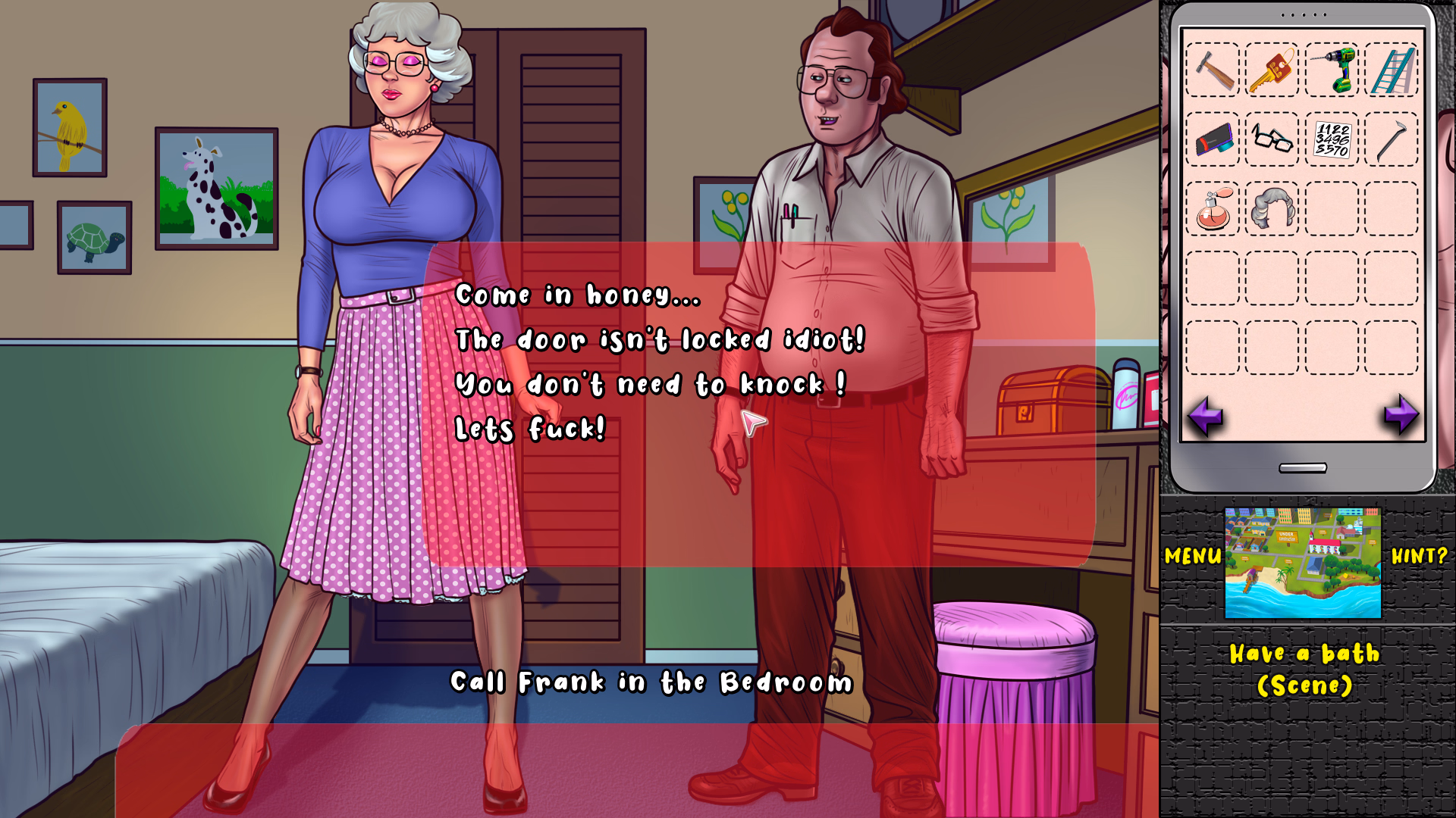 After talk with granny. Go to parents room and enjoy the scene with mom .talk lilly . After the scene you can go to sleepPick the bra in bathroom . Talk mom and dad . Give the bra mom and dad 3/4 time and granny appear.