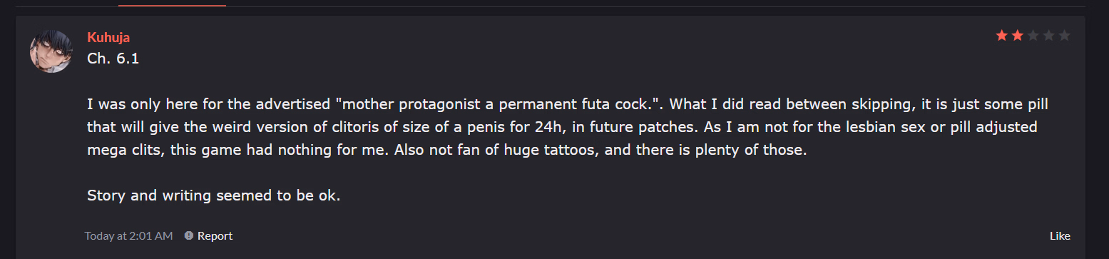 It's not optional and you're not spared from itIn case you and the others haven't noticed, the futa content is optional. You only have to make one decision at the "crucial" moment, and you're spared from it. So where is the problem?