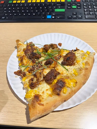 Okay, I've been having this pizza slice by my work the last few months, they call it a Korean pizza, which has BBQ chicken and corn and maybe something else with it. (Not my photo, not my keyboard).
