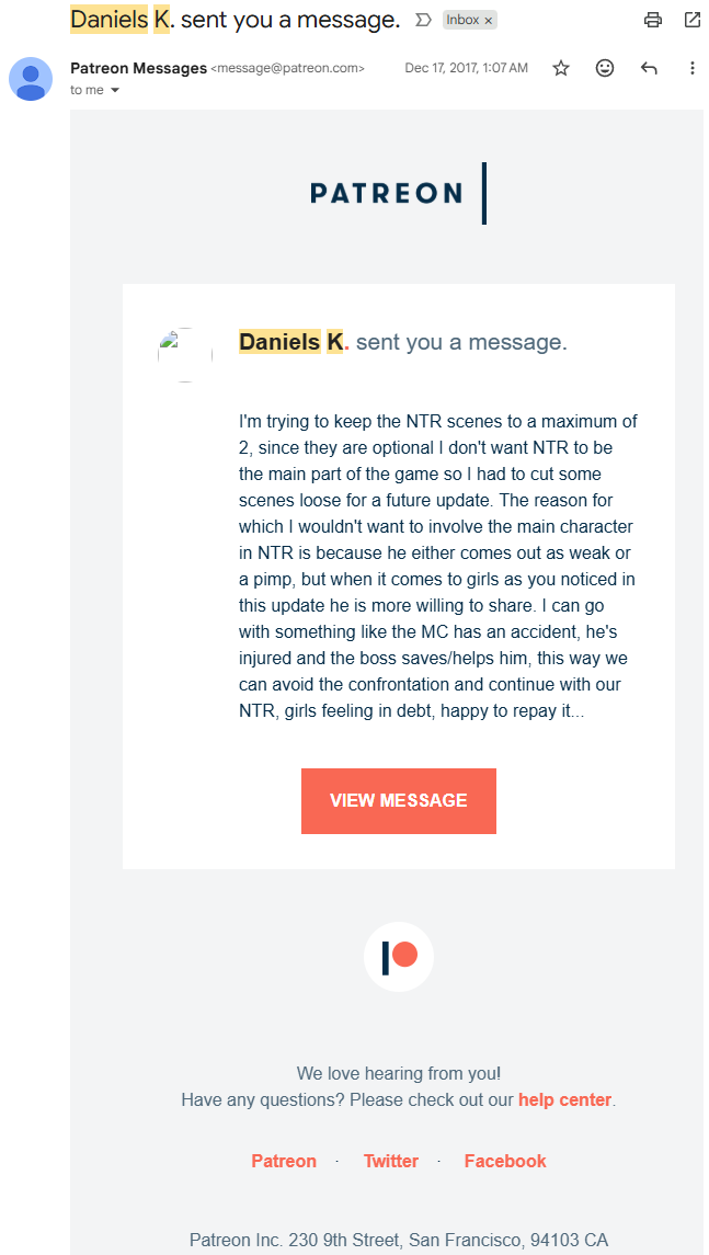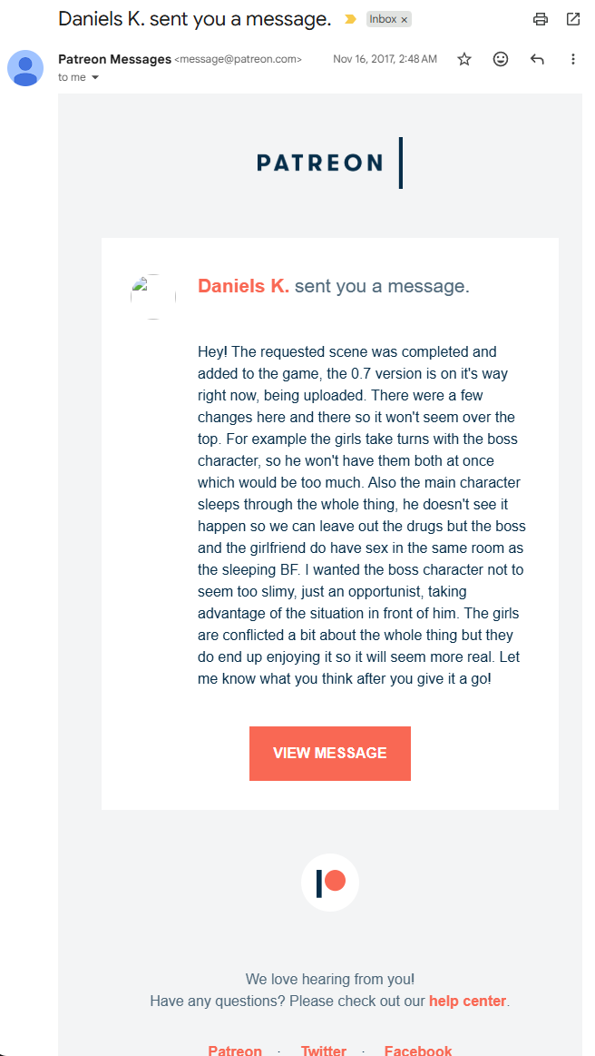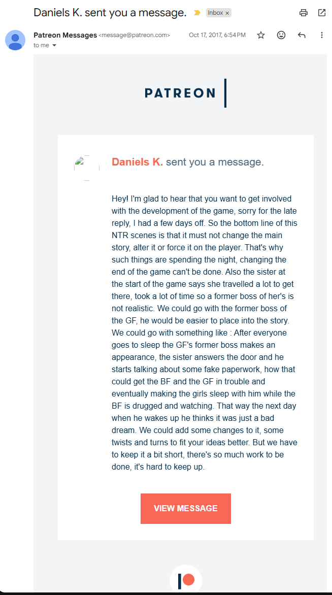EDIT: Went and looked back, messages are deleted off Patreon that long ago, but still have emails of one side of it. It was shaping up to be pretty hot, can't remember what I was saying, something like Boss bullies the MC and knocks him out, then pretends to help the MC inside saying he feinted, girls express their gratitude reluctantly. Seems like part 2 was going to happen still, and I agreed to the changes, but then nothing. Oh well, the NTR was great in this, I was more disappointed that his future games dropped NTR.