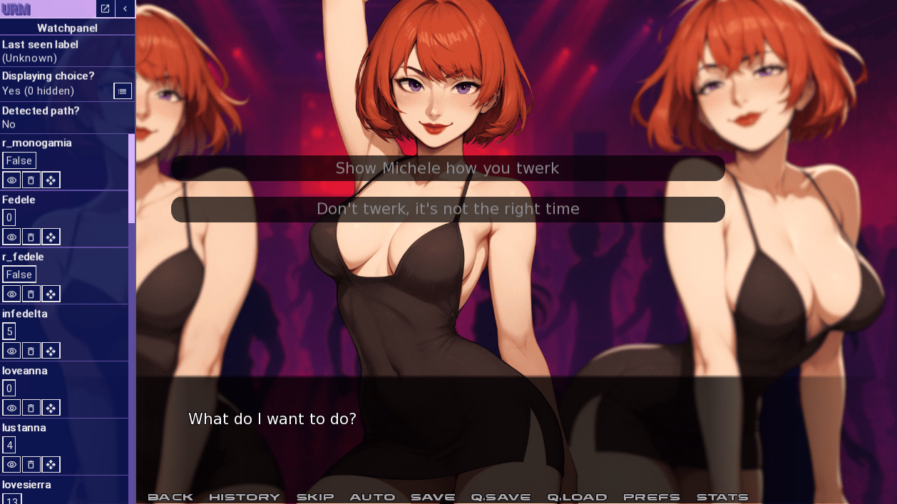 Molly doesn't actually give +infedelta on the NTS or Cuckquean route because there's a conditional that URM isn't picking up on that checks if you're on those routes and bypasses the "infedelta +=1" if so. You only get a point if you aren't on the NTS or cuckquean route.So i played the game again till end of Ch5 , i followed NTS Route , & made sure to never interact with any characters so i ended up with this choice fedele/Loyal :