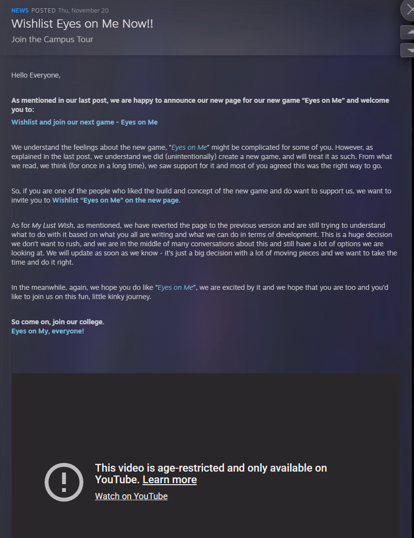Granted this is apparently a "new game" called eyes on me, and they reverted it back to the old MLW on steam anyways due to backlash, if anyone believes that excuse that it was never suppose to be a update to MLW, if that was the case they wouldn't be calling the game MLW to begin with and the same mc, still but i digress.