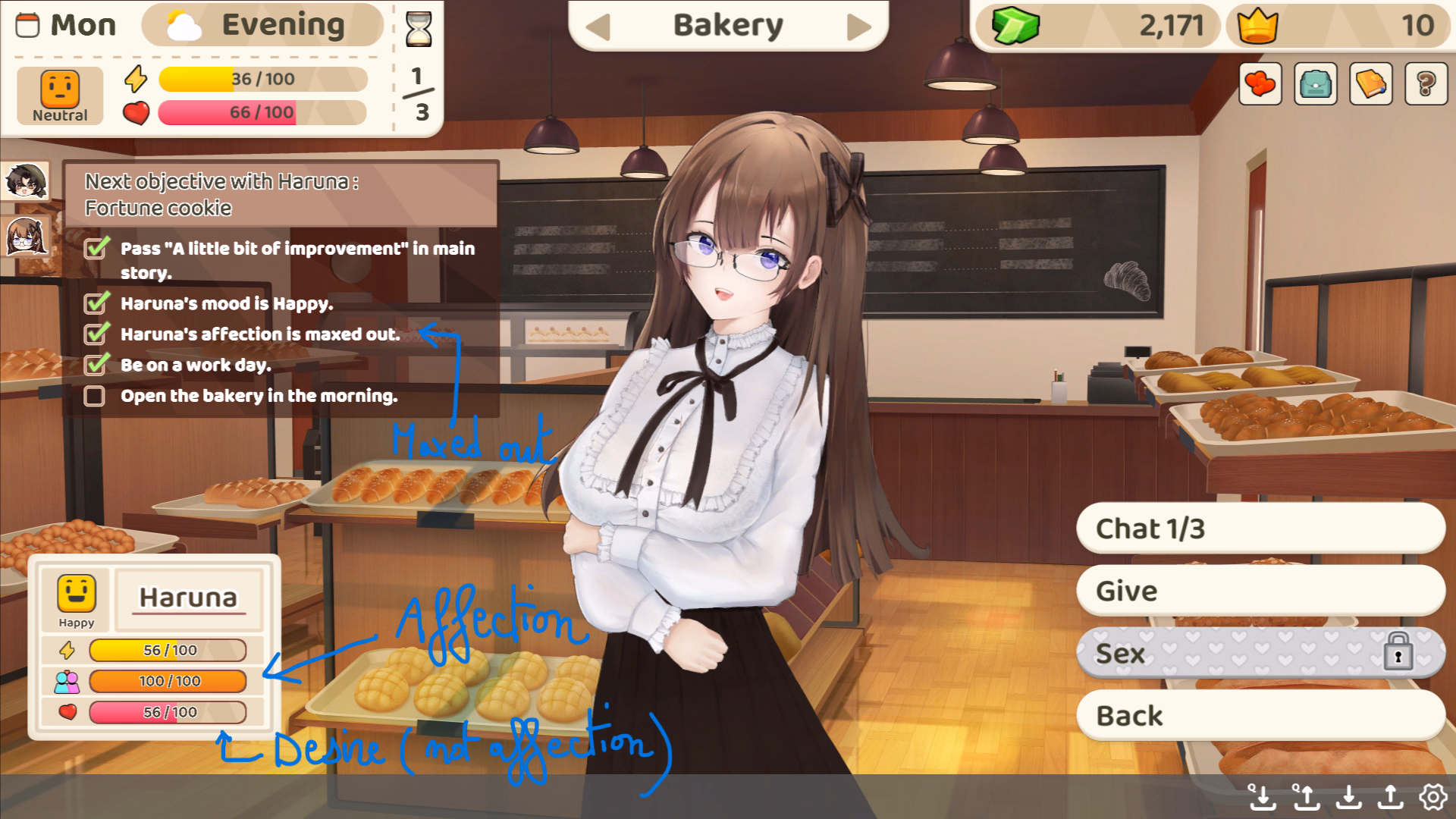 Thank you for reporting. It is not a bug. Affection is not expressed in the bottom bar with a heart, but in the middle bar with a cuddle. You increase her affection by chatting her up (while avoiding the topics that she does not like).I have harunas heart bar to 100 and it still does not say her affection is maxed so i can't do her first event. Am i doing something wrong?