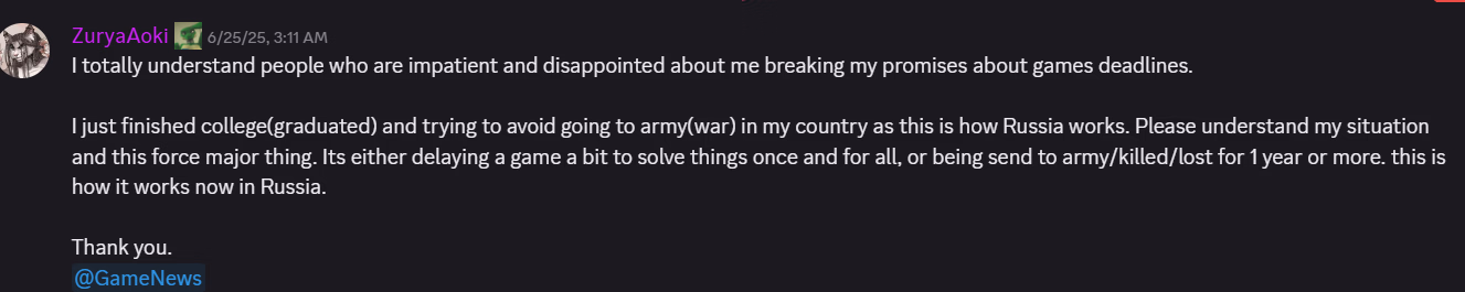 Possibly. If the developer can dodge military service. Then the deadlines will not be missed. Otherwise, we will have to wait a whole year. And then who knows. Maybe he will decide to give up on the project.